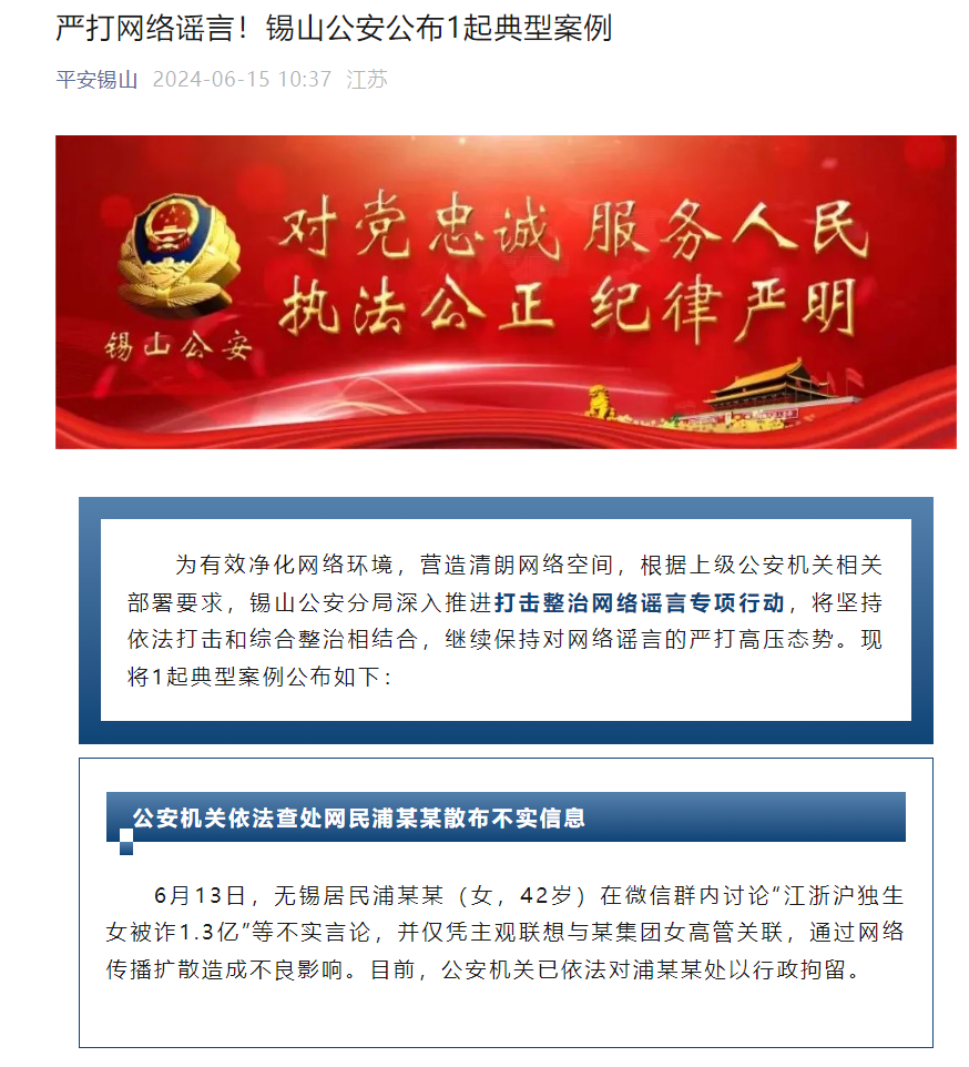 6月15日,江蘇無錫市公安局錫山分局發(fā)布通報(bào)稱,無錫居民浦某某(女,42歲)13日在微信群內(nèi)討論“江浙滬獨(dú)生女被詐1.3億”等不實(shí)言論,并僅憑主觀聯(lián)想,與某集團(tuán)女高管關(guān)聯(lián),通過網(wǎng)絡(luò)傳播擴(kuò)散造成不良影響。目前,公安機(jī)關(guān)已依法對浦某某處以行政拘留。